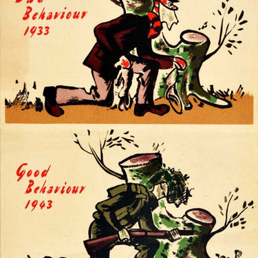 Original vintage World War Two poster - Bad Behaviour 1933 Good Behaviour 1943 - featuring a colourful illustration depicting a poacher holding a hare and hiding behind a tree stump demonstrating bad behaviour above an image of a soldier wearing camouflage and holding a rifle gun as he crouches behind the tree stump below showing good military practice and behaviour, the stylised text in red on the side. Reminder No. 1 Camouflage Chart No. 14A. Printed for H.M. Stationery Office by Fosh & Cross Ltd. Good condition, creasing, staining, pinholes, fold.