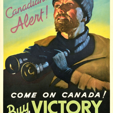 Original vintage World War Two poster - Canadians Alert! Come on Canada! Buy The New Victory Bonds - featuring an illustration by Archibald Bruce Stapleton (1910-1981) depicting a bearded man in a coat and hat holding a pair of binoculars in front of a dramatic blue and yellow shaded background, the bold stylised text on the side above and below. Excellent condition.