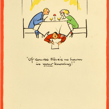 Original vintage World War Two poster by the notable British cartoonist and illustrator Fougasse (Cyril Kenneth Bird; 1887-1965), from the popular iconic Careless Talk Costs Lives wartime propaganda series issued by the Ministry of Information - Of course there's no harm in your knowing! - featuring a couple in a restaurant leaning forward over their wine glasses talking with an image of Hitler wearing a Nazi swastika armband lying under their table with a pen and paper taking notes, set within a red border with the stylised warning text in black lettering below. Very good condition, minor creasing, minor staining.