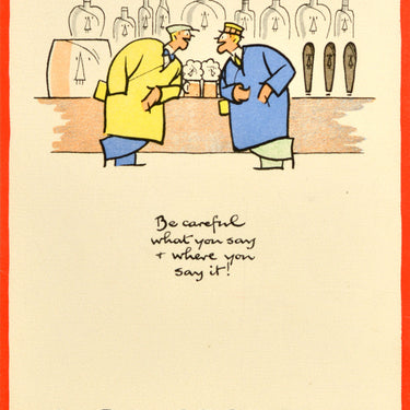 Original vintage World War Two poster by the notable British cartoonist and illustrator Fougasse (Cyril Kenneth Bird; 1887-1965) from the popular Careless Talk Costs Lives wartime propaganda series issued by the Ministry of Information - Be careful what you say and where you say it! - featuring an image of two men talking at the bar in a pub with Hitler's face on the beer taps and bottles and on the beer froth. Very good condition, minor staining.