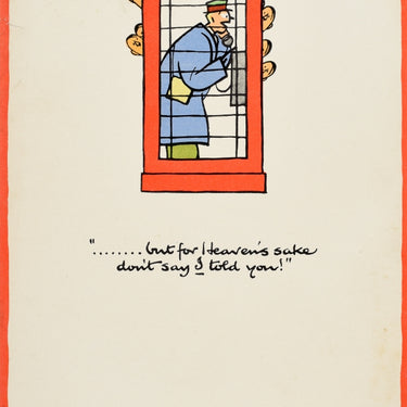 Original vintage World War Two poster by the notable British cartoonist and illustrator Fougasse (Cyril Kenneth Bird; 1887-1965) from the popular and iconic Careless Talk Costs Lives wartime propaganda series issued by the Ministry of Information - ...but for Heaven's sake don't say I told you! - featuring an image of a person wearing a coat and hat, talking on the phone in a traditional English red telephone box with Adolf Hitler faces peeking from all over the telephone booth listening to the conversation, the stylised text below. Good condition, restored tears, staining, backed on linen.