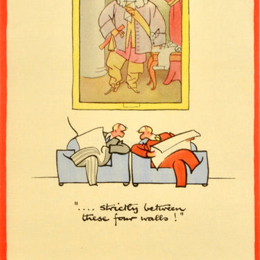Original vintage World War Two poster by the notable British cartoonist and illustrator, Fougasse (Cyril Kenneth Bird; 1887-1965). This is one of the posters from the popular Careless Talk Costs Lives wartime propaganda series issued by the Ministry of Information - "...strictly between these four walls!" Image of two men at the gentleman's club sitting in armchairs and holding newspapers with an image of Hitler's face in a portrait hanging behind them. Very good condition, minor creasing, minor paper skimming, some very small tears, ink stamp on reverse for British Information Services, New York City.
