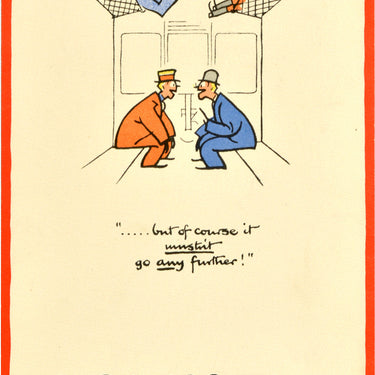 Original vintage World War Two poster by the notable British cartoonist and illustrator Fougasse (Cyril Kenneth Bird; 1887-1965), one of the posters from the popular Careless Talk Costs Lives wartime propaganda series issued by the Ministry of Information - "But of course it mustn't go any further!" Great image of two men talking in their train carriage with the legs of Hitler and Goering peeking out from the overhead luggage rack above them. Very good condition, minor creasing, minor staining.