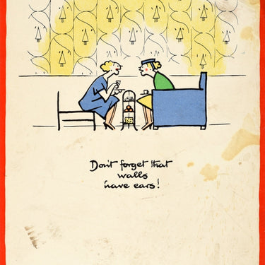 Original vintage World War Two poster by the notable British cartoonist and illustrator Fougasse (Cyril Kenneth Bird; 1887-1965), one of the posters from the popular Careless Talk Costs Lives wartime propaganda series issued by the Ministry of Information - Don't forget that walls have ears! - featuring two ladies leaning forward and chatting over their afternoon tea in front of a wall covered with images of Hitler with the slogan in stylised black letters below. Fair condition, staining, backed on linen.