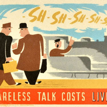 Original vintage World War Two propaganda poster - Careless Talk Costs Lives - featuring an illustration of two gentlemen wearing suits and hats and holding briefcases and an umbrella talking in the foreground, a steam train driver in the background pointing up at the smoke above showing the sound Sh-Sh-Sh warning them to be careful about what they're saying to each other. Printed by Norbury, Lockwood & Co Ltd, Manchester. Horizontal. Very good condition, minor creasing, minor staining.
