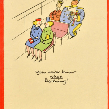 Original vintage World War Two poster by the notable British cartoonist and illustrator Fougasse (Cyril Kenneth Bird; 1887-1965) from the popular and iconic Careless Talk Costs Lives wartime propaganda series issued by the Ministry of Information - You never know who's listening! - featuring a great design depicting two ladies chatting on public transport with Adolf Hitler and Hermann Goering in uniform sitting in the bus behind them and the stylised warning text in black lettering below. Very good condition, minor creasing, minor staining.