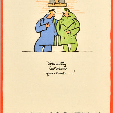 Original vintage World War Two poster by the notable British cartoonist and illustrator Fougasse (Cyril Kenneth Bird; 1887-1965) from the popular and iconic Careless Talk Costs Lives wartime propaganda series issued by the Ministry of Information - Strictly between you and me... - featuring a great military design of a navy sailor and army soldier in uniform talking in front of a wall with Hitler listening from an open window above, set within a red border with the stylised warning text in black lettering below. Very good condition, minor creasing, minor staining.
