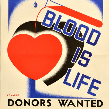 Original vintage World War Two poster - Your War Service Blood is Life Donors Wanted - featuring a dynamic colourful design depicting a vial pouring blood onto a red heart with a shadow of the heart in black on the white and blue background, the text diagonally next to the image in bold blue lettering and in black above with the MH Ministry of Health crown logo and below. Good condition, folds, tears, creasing, small paper losses, minor staining.