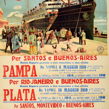 Original antique cruise travel advertising poster for Societe Generale de Transports Maritimes a Vapeur / Maritime Steam Transport services from Napoli / Naples Italy to Pampa Plata and Algerie / Algeria via Santos Buenos Aires Rio de Janeiro Brasil / Brazil and Montevideo South America featuring a colourful image of the ship Parana (1908-1917) docked in a busy port with a large SGTM flag on the side above people on the dock, families and children playing in front of men loading crates and boxes with the information text below. Large size. Good condition, restored paper losses, restored tears, restored folds, staining, backed on linen.
