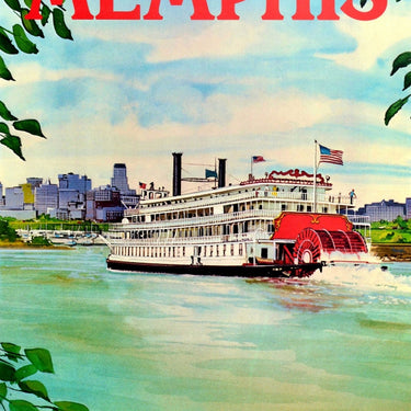 Original vintage travel poster for Memphis Tennessee issued by United Airlines featuring a great image of a paddleboat steamer flying American flags and sailing down the Mississippi river with boats in a marina and the city skyline in the background, framed by leaves from a tree with the bold red lettering above and United Airlines logo below. Excellent condition.