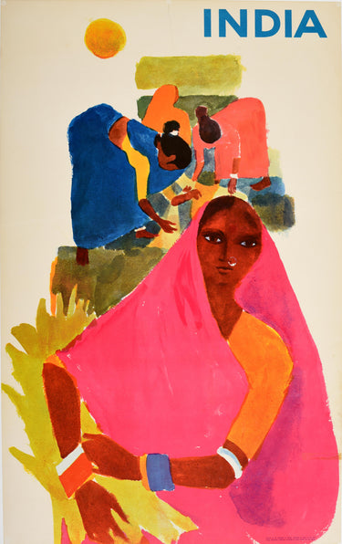 Original vintage travel poster for India featuring colourful artwork of people working on a field with a lady in the foreground and a sun in the sky next to the bold blue title text. Produced for the Department of Tourism Government of India and printed by Prasad Ltd Madras. Good condition, restored tears, restored paper losses, staining, tape marks, backed on linen.