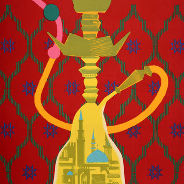 Original vintage Near East travel poster issued by Air France featuring colourful artwork by Eric Castel (1915-1997) depicting an image of city domes and minarets with a palm tree reflected on calm water in the shape of a traditional hookah smoking pipe on a patterned background with a plane flying above. Good condition, restored tears, restored pinholes, restored creasing, minor staining, backed on linen.