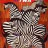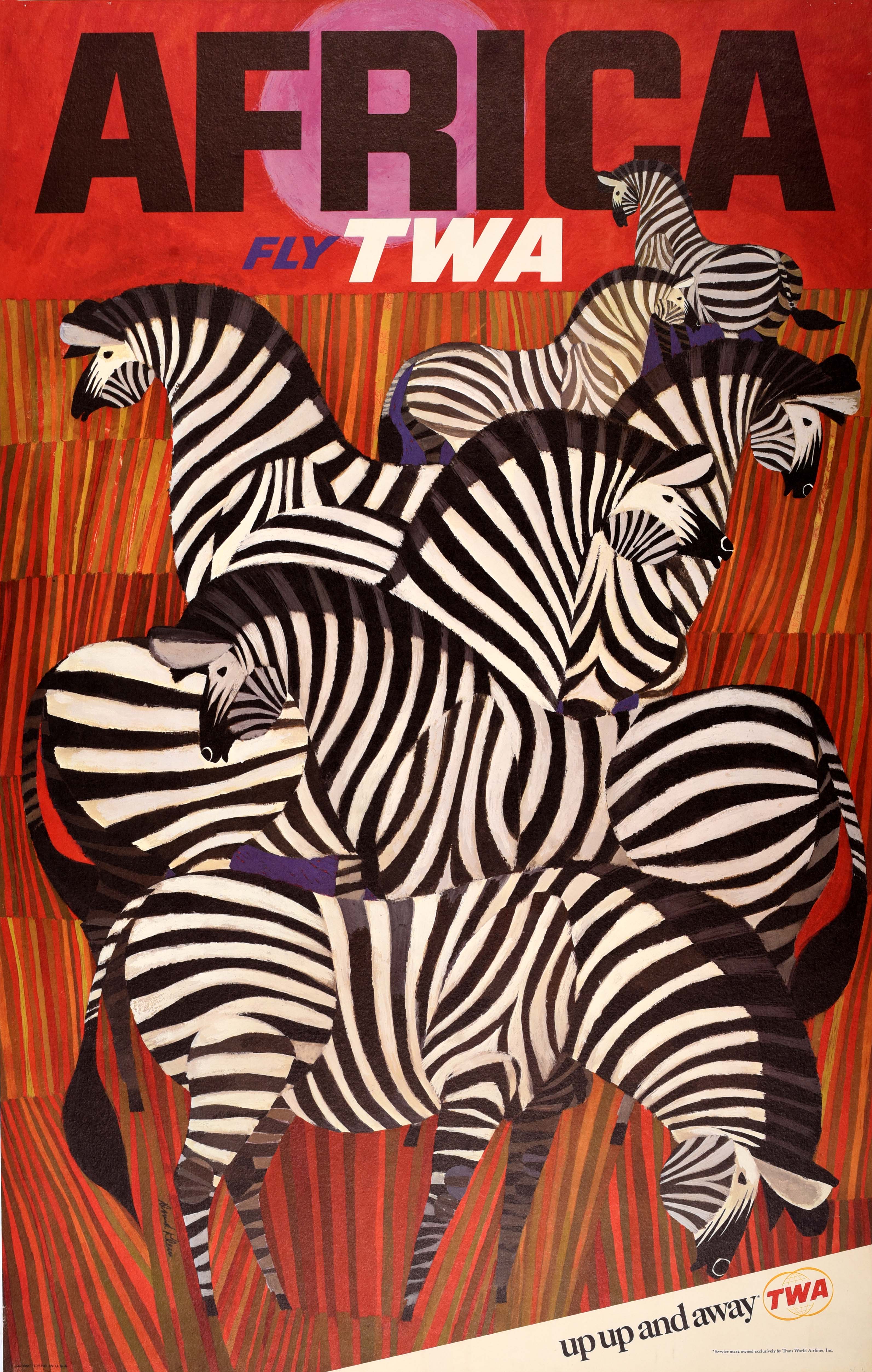 Original vintage mid-century airline travel poster for Africa Fly TWA Trans World Airlines up up and away TWA featuring a colourful iconic design by the notable American artist David Klein (1918-2005) of black and white zebras against a striped savanna grassland background, a purple sun in the red sky with the stylised text above and below with the TWA logo. Litho in USA. Good condition, restored tears, restored pinholes, minor staining, backed on linen.