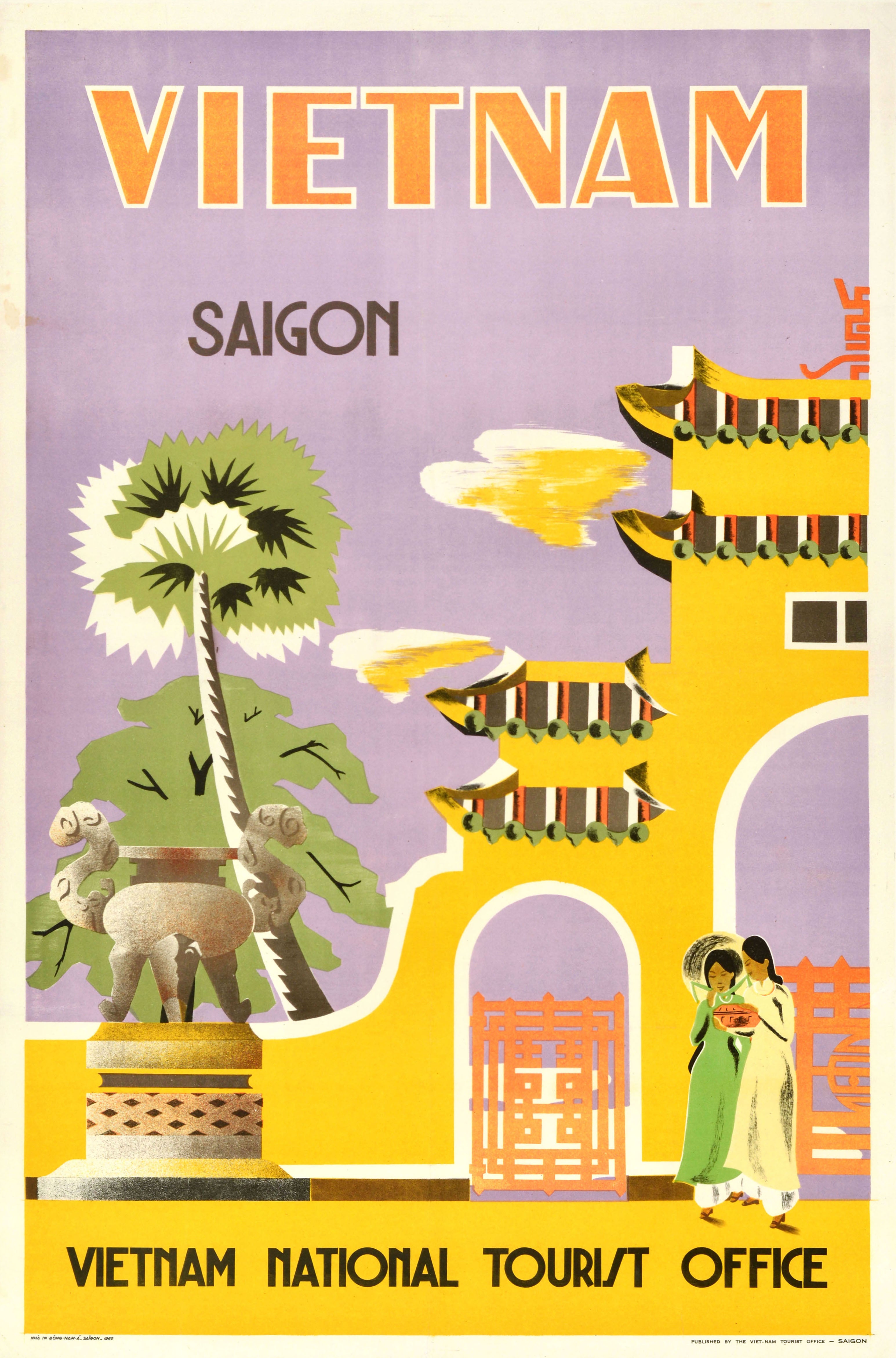 Original vintage travel poster promoting tourism to Vietnam Saigon featuring a stylised Art Deco-inspired design with a dominant yellow and lavender colour palette, with a traditional Vietnamese pagoda with layered curved roofs rising against a soft purple sky with golden clouds, two ladies dressed in traditional ao dai garments shown walking together, with a stone incense burner beside stylised tropical foliage and a palm tree, evoking the country’s temples and lush landscape. Published by the Vietnam Tourist Office, Saigon. Good condition, restored folds, restored tears, staining, backed on linen.