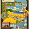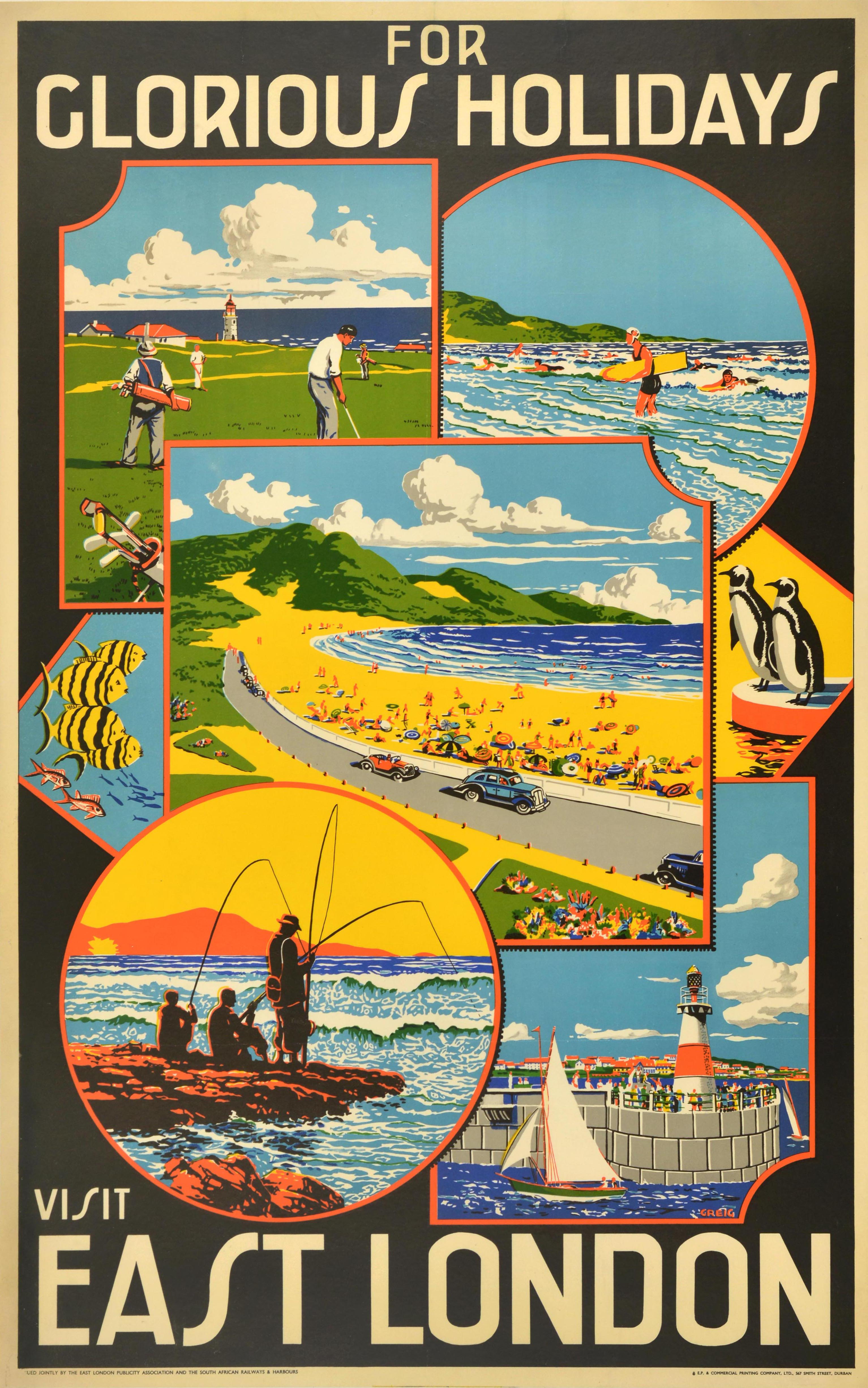 Original vintage South Africa travel poster - For Glorious Holidays Visit East London - featuring a great design by James Greig (1861-1941) with circular and rectangular framed illustrations of various sports and leisure activities including men playing golf on a course with a view of a lighthouse (possibly the Hood Point Lighthouse) and the Indian Ocean, people surfing in the waves with green hills in the background, fish swimming in the sea on the left and penguins on the right, sailing boats watched by people on a harbour wall by a lighthouse, holiday makers sun bathing and relaxing under umbrellas on a large sandy beach and swimming in the sea with classic cars driving along on the coastal road passing colourful flowers in the foreground under the blue sky, and the stylised bold title text on the black background above and below. The city of East London is located on the southeastern coast of South Africa, Eastern Cape Province. Issued jointly by the East London Publicity Association and The South African Railways and Harbours. Printed by E.P. and Commercial Printing Company Ltd. Good condition, folds, restored tears, restored paper losses, minor staining, backed on old linen.