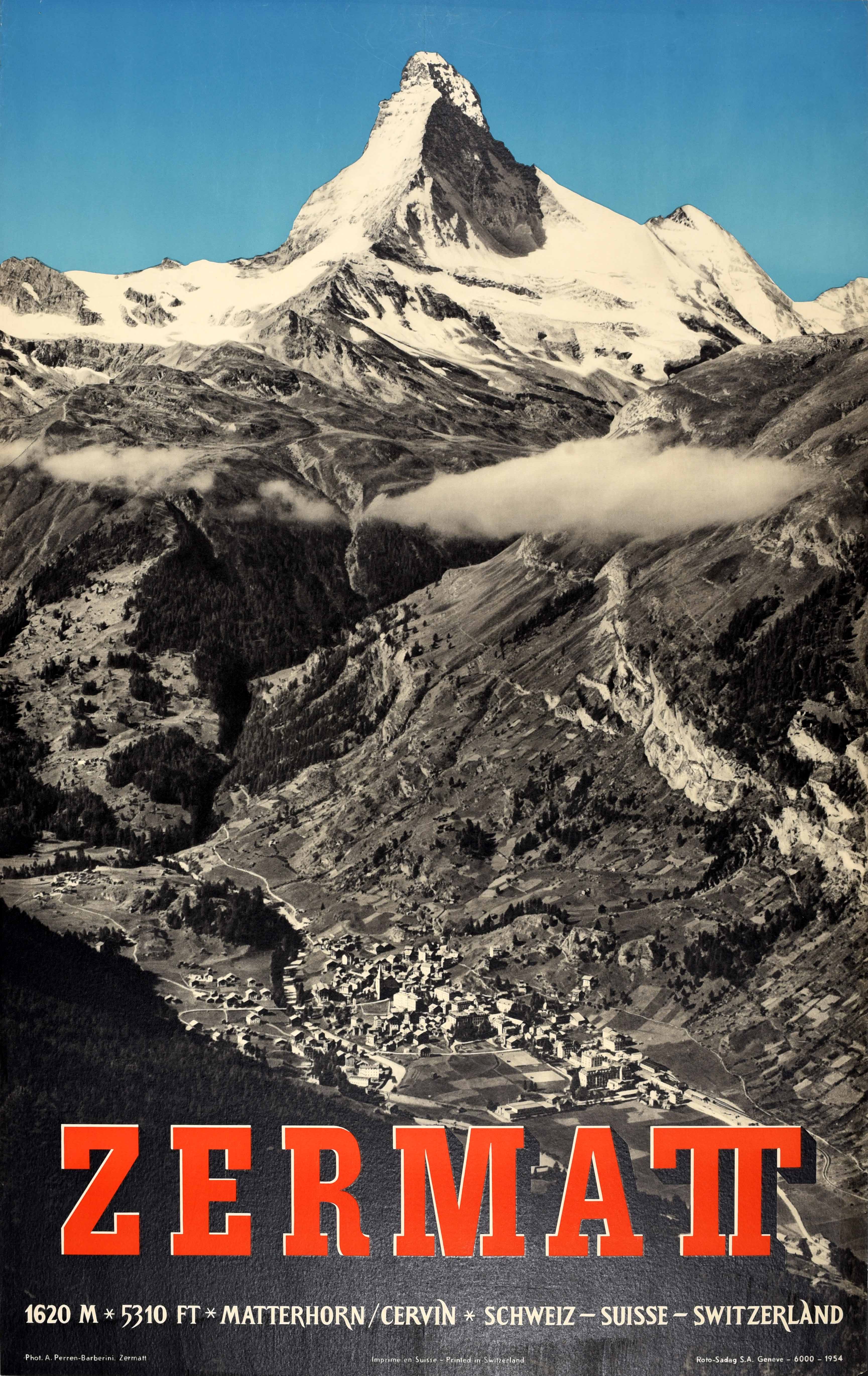 Original vintage travel poster for the popular skiing and winter sport resort town of Zermatt 1620m 5310ft Matterhorn / Cervin located in the Valais canton of southwest Switzerland Schweiz Suisse Zermatt featuring a scenic black and white photograph view by Alfred Perren-Barberini (1896-1967) of the valley town nestled below the Alps with the buildings, church spires, wooden farm chalets and sport fields dominated by the snow topped Matterhorn mountain rising into the blue sky in the distance, the title in bold red lettering below. Printed by Roto-Sadag S.S. Geneva. Good condition, small restored paper losses, restored tears, restored pinholes, minor creasing, minor staining, backed on linen.