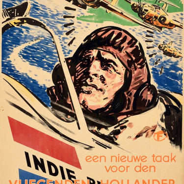Original vintage World War Two poster - Indie bevrijden Een nieuwe taak voor den Vliegenden Hollander / Liberate India Dutch East Indies A new task for The Flying Dutchman - featuring a dynamic image of a fighter pilot in his plane marked with the flag colours in front of more planes flying over land and a ship at sea with explosions and bombs dropping in the background. Artwork by the painter and poster designer Harold Foster (famous for his Keep Mum She's Not So Dumb war poster). Good condition, small paper loss, restored creases, restored tears, staining, backed on linen.