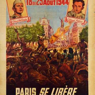 Original vintage World War Two poster commemorating the Liberation of Paris military battle that took place from 18 to 24 August 1944 between France and Nazi Germany resulting in the freedom of the French capital after four years of Nazi occupation in northern and western France. Dynamic artwork by Rene Brantonne (1903-1979) features a dramatic illustration of soldiers and civilians with guns and other weapons crowded by barricades with a tank in the Place de la Republique city square by the Monument a la Republique depicting Marianne (the personification of France) and historical buildings and trees in the background, smaller images of Colonel Roll Tanguy and Colonel Fabien are displayed above the battle scene with the date. Henri Roll-Tanguy (1908-2002) was a communist leader, fighter and commander of the French Forces of the Interior in the Ile-de-France. Pierre Georges (Colonel Fabien; 1919-1944) was a member of the French Communist Party who organised the Free French Forces and fought against the German Nazi occupation. Fair condition, restored paper losses, restored folds, restored creasing, staining, foxing, backed on linen.