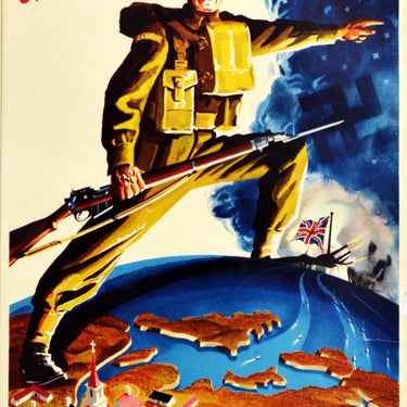 Original vintage World War Two poster - Lick Them Over There! Come On Canada! - featuring a dramatic image depicting soldier in uniform holding a bayonet rifle gun in one hand and looking at the viewer, pointing towards Nazi German Swastika symbols in the battle smoke above Great Britain as he steps over the Atlantic Ocean on a map on the globe below, a peaceful church and village in Canada by his right boot and a Union Jack flag flying behind anti-aircraft guns by his left leg with warships sailing across the sea to help defeat the enemy, the stylised text in red above the soldier shouting and in bold blue lettering below. Issued for the Department of National Defence by the Director of Public Information Ottawa. Printed in Canada. Good condition, paper losses, staining, tears.