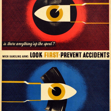 Original vintage World War Two safety poster - When handling arms Look first Prevent accidents Is there anything 'up the spout'? Is that magazine really empty? Great modernist design by the notable British graphic designer Abram Games (Abraham Gamse; 1914-1996) depicting two bullets as eyes looking at the viewer, the bullet eye in front of the muzzle of a gun against a red background at the top and in front of a firearm magazine against a blue background below, the warning text in bold in the centre with the questions in stylised lettering by each illustration as a reminder about the necessary safety checks. Printed for HM Stationery Office by TG Porter Ltd, Leeds. Good condition, creasing, pinholes, small tears, minor staining.