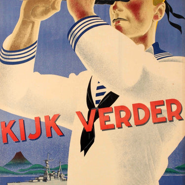 Original vintage World War Two propaganda poster featuring an illustration of a sailor in uniform holding binoculars with a military ship in the background and text diagonally in red and below in black reading: Kijk verder ook indië moet bevrijd / Look further India too must be liberated. Printed in England by James Haworth and Brother Ltd London. Fair condition, restored paper loss, tears and creases, light staining, backed on linen.