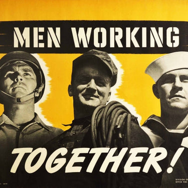 Original vintage World War Two poster - Men Working Together! - featuring a US Army soldier and Navy sailor in military uniform standing behind a smiling factory worker with rubber pipes over his shoulder in front of a yellow shaded background, the bold text above and below reinforcing the message that people working on the home front and soldiers fighting on the battle front are equally important as each other. Issued by the Division of Information Office for Emergency Management, Washington, D.C. Published by U.S. Government Printing Office. Horizontal. Good condition, creasing, tears, folds, staining.