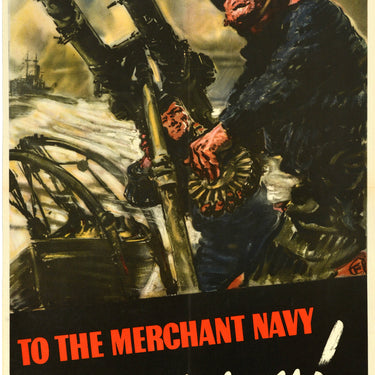 Original vintage World War Two poster - To The Merchant Navy Thank You! - featuring a dynamic nautical design by Harold Percy Forster (1895-1975) showing two members of the MN Merchant Navy on board a ship at sea manning a gun with a red ensign union jack flag flying in the background, a military warship in the distance and the text in bold red and white lettering with the Merchant Navy insignia on a black banner below. Printed in England by Henry Hildesley Ltd. Good condition, folds, creasing, tears, minor staining.