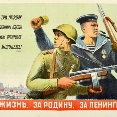 Original vintage Soviet propaganda poster - For Life, For The Motherland, For Leningrad! - featuring great artwork of a young Navy sailor with a medal on his blue uniform throwing a grenade and holding a rifle gun next to a young Red Army soldier in green military uniform holding an automatic gun with tanks lined up and flying red flags in front of the city buildings in the background, the quote on the side translating to - You, like a thundercloud storm against the enemy, are going to change our front-line combat youth! - and the slogan against the red background below. Horizontal. Good condition, folds, staining, creasing, pinholes.