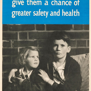 Original vintage World War Two propaganda poster - Mothers let them go – give them a chance of greater safety and health Ministry Of Health Evacuation Scheme - featuring a black and white photograph of two children sitting in front of a brick wall, the young boy looking out to the viewer and protecting his younger sister with his arm around her, the text against a blue background above and below. The evacuation during WWII known as Operation Pied Piper started in 1939, organised by the Ministry of Health to protect people from the bombing in cities by moving over 3.5 million evacuees to the safety of the countryside and other countries in the British Empire. Very good condition, restored tear on right margin, backed on linen.