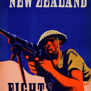 Original vintage World War Two propaganda poster - New Zealand Fights - featuring a colourful bold design depicting a New Zealand soldier in uniform and wearing a helmet leaning on his elbows and aiming a machine gun against the blue background, the text above and below. Good condition, restored tears, light staining, backed on linen.