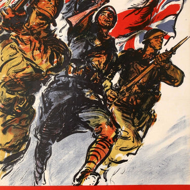 Original vintage French World War Two poster featuring a dynamic painting depicting three soldiers - one American, one French and one British - charging into battle side by side with the flags of their respective countries flying overhead, the text in white on a red banner below: On Les Aura! / We'll Get Them! Very good condition, restored fold marks, backed on linen.