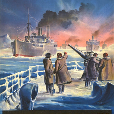 Original vintage World War Two home front fundraising poster - On the Arctic Front Merchant Navy Comforts Service - featuring an naval illustration of sailors in thick coats and hats on an icy frozen deck of a ship with the gun pointing towards ships sailing towards them with the smoke rising into the blue and pink shaded sky with icebergs visible on the side, the bold text above and below - Appeal Headquarters 62 Heath Street London NW3. Printed by McCorquodale & Co. Ltd, London. Good condition, creasing, pinholes, small tears on edges.