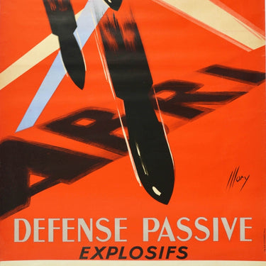Original vintage World War Two poster - Abri Defense Passive Explosifs / Explosives Passive Defence Shelter - featuring a dynamic design depicting searchlights shining up and bombs flying down from a plane over the word Abri / Shelter in flat stylised lettering against a red background, the rest of text below. Large size. Good condition, creasing, tears, staining, small paper loss in top right corner, separate sheet attached on bottom edge.