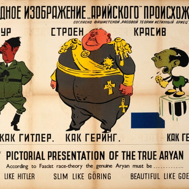 Original vintage Soviet propaganda poster in Russian and English entitled Pictorial Presentation of the True Aryan with the sub heading reading "According to Fascist race theory the genuine Aryan must be..." and text above and below the satirical cartoon illustrations of the Nazi German leaders: the Fuhrer Adolf Hitler (1889-1945) in uniform with a swastika on his belt buckle and the text reading "Blond like Hitler" standing on one side of a depiction of an overweight Reichsmarschall Hermann Goring (1893-1946) with the text reading "Slim like Goring" and a caricature of the Reich Minister of Propaganda Joseph Goebbels (1897-1945) as a green Mickey Mouse with the text reading "Beautiful like Goebbels" (the English translations below). Printed in England by Stafford & Co Ltd, Netherfield, Nottingham. Horizontal. Fair condition, staining, browning, restored paper losses, folds, restored tears, misregistered print mark, backed on linen.