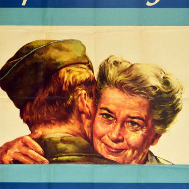 Original vintage World War Two poster - Speed the day! 7th War Loan - featuring a touching illustration of an older lady with tears in her eyes hugging a man in a US army soldier uniform with the bold white text on blue banners above and below. Good condition, folds, creasing, minor tears on margins, repaired tear.