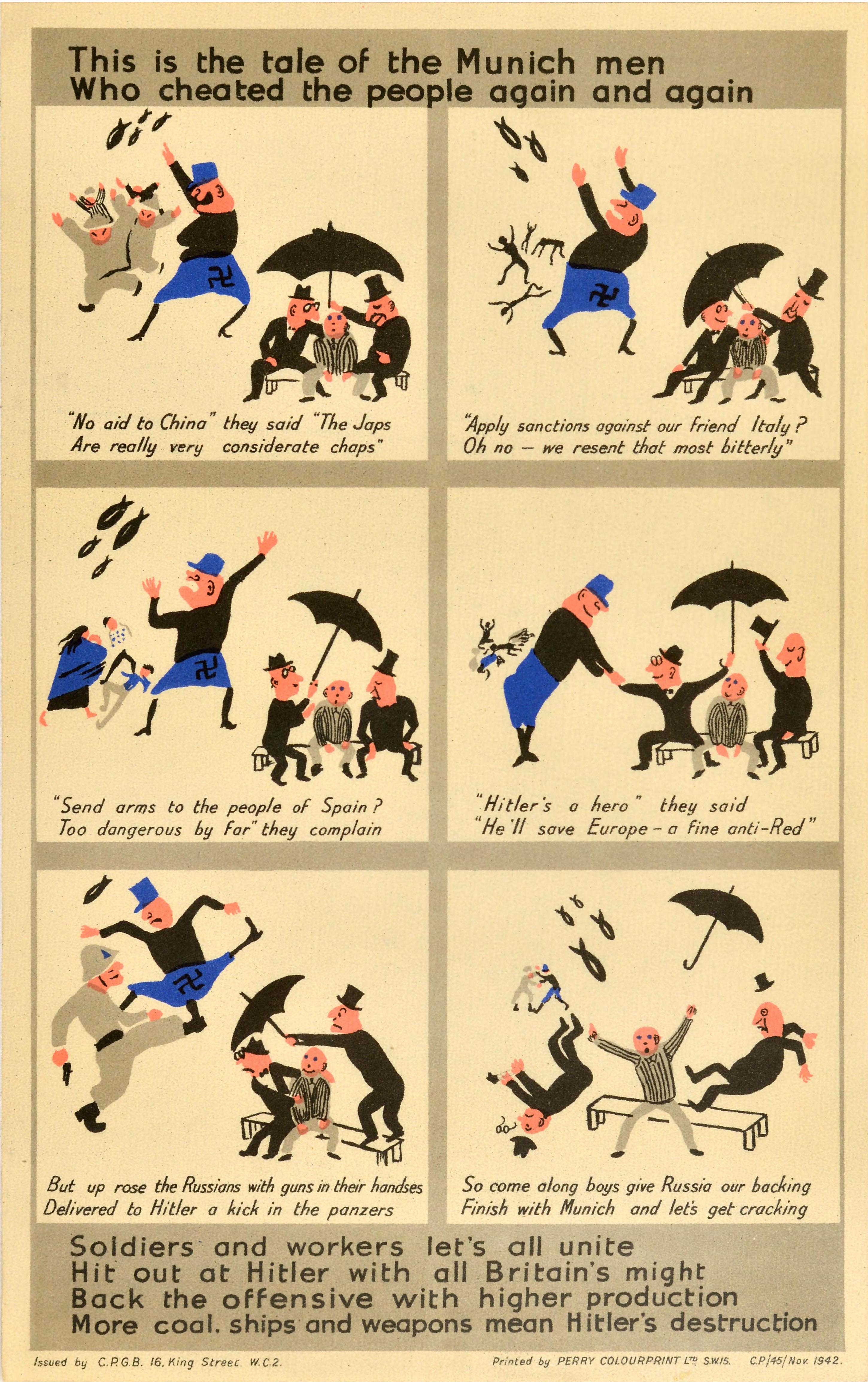 Original vintage World War Two workplace motivation Home Front propaganda poster featuring a cartoon story in rhymes with each poem accompanied by images - This is the tale of the Munich men Who cheated the people again and again "No aid to China" they said "The Japs are really very considerate chaps" "Apply sanctions against our friend Italy? Oh no - we resent that most bitterly" "Send arms to the people of Spain? Too dangerous by far" they complain "Hitler's a hero" they said "He'll save Europe - a fine anti-Red" But up rose the Russians with guns in their handses Delivered to Hitler a kick in the panzers So come along boys give Russia our backing Finish with Munich and let's get cracking Soldiers and workers let's all unite Hit out at Hitler with all Britain's might Back the offensive with higher production More coal, ships and weapons mean Hitler's destruction - the six images showing two men in suits sheltering a man between them under an umbrella on a bench with a man with a swastika on his trousers and a group of Asian people in the background; bombs falling with the men on the bench smiling; a lady carrying a baby and people looking shocked as bombs fall overhead; the men on the bench smiling with one shaking hands with the man marked with a swastika; a soldier in military uniform kicking the German with a bomb falling watched by the men on the bench; and the man on the bench suddenly standing up ready for action, pushing over the two other men with their glasses and hat falling off, people fighting and bombs falling in the background. Issued by the Communist Party of Great Britain. Printed by Perry Colourprint. Very good condition, creasing.