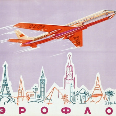 Rare original vintage advertising poster for the Soviet State Airline, Aeroflot. Great mid-century design featuring a jetliner aircraft (Tupolev Tu-104?) flying over the skylines of the American, European and Asian capitals of the world represented by buildings, including the Eiffel Tower for Paris, the Big Ben clock tower for London, a pyramid for Cairo and the Kremlin for Moscow. Horizontal. Excellent condition.