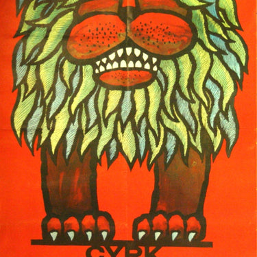 Original vintage Polish circus advertising poster: Cyrk, featuring a great image of a lion on a red background. Printed in Poland, Wroclaw. Good condition, folded.