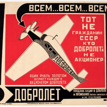 Rare original vintage travel advertising poster for the early Soviet airline, Dobrolet/Dobrolyot (Добролёт), by one of the most renowned Russian artists and designers, Alexander Rodchenko (1891-1956). Striking colours, Constructivist style. Image features a plane flying upwards with text: Calling all! He who is not a shareholder of Dobrolet is not a citizen of the USSR - One ruble in gold will make anyone a shareholder of Dobrolet. The airline was formed in 1923 and was consolidated with other Soviet aviation organisations to become Aeroflot in 1932. Very good condition, minor restored losses, backed on linen.