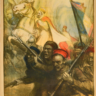 Original antique World War One poster - Journee de l'Armee d'Afrique et des Troupes Coloniales / African Army and Colonial Troops Day - featuring dynamic artwork of Moroccan and Algerian infantry soldiers armed with rifles charging forward under the red, white and blue tricolour flag of France in front of a mounted Spahi cavalry regiment galloping on their horses below an inscription above in Arabic, the bold title text on the margin below the image. Printed by Lapina, Paris. Large size. Good condition, restored tears, restored paper losses, minor staining, backed on linen.