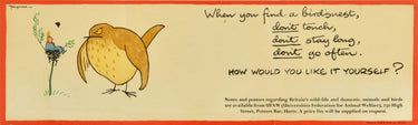 Original vintage educational poster by the notable British cartoonist and illustrator Fougasse (Cyril Kenneth Bird; 1887-1965) promoting the respect and care of animals featuring a fun illustration of a large angry bird looking at a startled person in a bird's nest on a tree with his hat flying up, the bold advice on the side - When you find a bird's nest, don't touch, don't stay long, don't go often. How would you like it yourself? - and information below - Notes and posters regarding Britain's wildlife and domestic animals and birds are available from UFAW (Universities Federation for Animal Welfare), 230 High Street, Potters Bar, Herts A price list will be supplied on request. The UFAW animal welfare science society was founded in 1926 by Major Charles Westley Hume (1886-1981). Printed by Fosh & Cross, London. Horizontal. Good condition, creasing, folds, tears, staining.