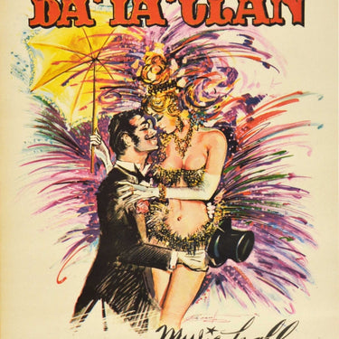 Original vintage advertising poster for a cabaret performance Ba-Ta-Clan at the Music Hall de Paris featuring a man in a suit holding a top hat with his arm around a scantily dressed dancer in a sparkly outfit and jewellery with long white gloves, holding a yellow umbrella in front of a colourful background. Printed by Lusitane. Very good condition, creasing, browning, backed on linen.