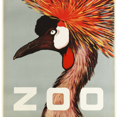Original vintage advertising poster for Barcelona Zoo (opened 1892) featuring fantastic artwork showing the head of an African crowned crane (this native bird of Africa is also called a grey crowned crane / golden crested crane) with its colourful golden crest and bright red inflatable throat pouch against the pale background with the title text below in bold black and white letters. Good condition, creasing, small paper loss on margin, some staining.