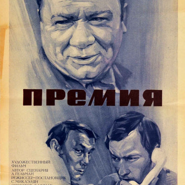 Original vintage Soviet movie poster for drama film Премия / The Bonus directed by Sergey Mikaelyan in 1974, starring Evgeniy Leonov, Vladimir Samoylov, Oleg Yankovskiy, Mikhail Gluzski and Armen Dzhigarkhanyan, featuring an illustration of the main characters in blue and white, one on a telephone and another looking over his shoulder, with the bold black title text across the image. The plot follows a scandal during a Communist Party meeting in a construction trust during which employees announce their refusal to receive their bonus money for over fulfilling the planned targets. Good condition, folds, staining, creasing, small tears.