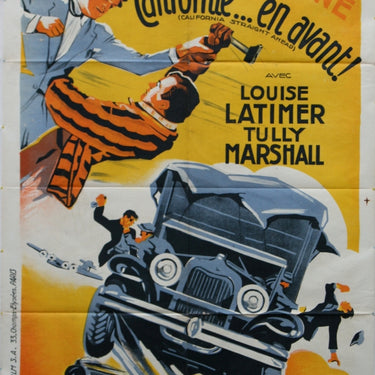 Original vintage cinema poster for a film, California Straight Ahead. Issued in France by Universal Film in Paris. Lithograph designed by Joseph Koutachy. Film featuring John Wayne, Louise Latimer and Tully Marshall. Great image of a truck veering off the road with an aeroplane and train in the background and John Wayne in a fight at the top of the poster. Good condition. Folded.