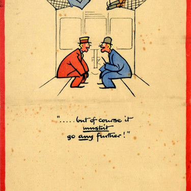 Original vintage World War Two poster by the notable British cartoonist and illustrator Fougasse (Cyril Kenneth Bird; 1887-1965), one of the posters from the popular Careless Talk Costs Lives wartime propaganda series issued by the Ministry of Information - "...but of course it mustn't go any further!" Great image of two men talking in their train carriage with the legs of Hitler and Goering peeking out from the overhead luggage rack above them. Fair condition, foxing, creasing, fold, staining.