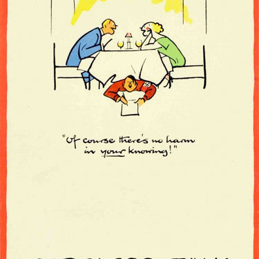 Original vintage World War Two poster by the notable British cartoonist and illustrator Fougasse (Cyril Kenneth Bird; 1887-1965), from the popular iconic Careless Talk Costs Lives wartime propaganda series issued by the Ministry of Information - Of course there's no harm in your knowing! - featuring a couple in a restaurant leaning forward over their wine glasses talking with an image of Hitler wearing a Nazi swastika armband lying under their table with a pen and paper taking notes, set within a red border with the stylised warning text in black lettering below. Good condition, repaired tears, creasing, paper skimming, backed on linen.