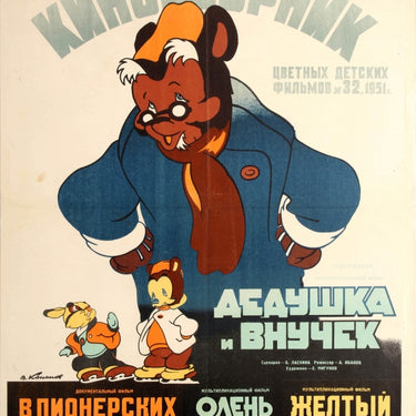 Original vintage Soviet animation film poster for cartoons for children featuring a large bear character wearing glasses and a blue coat looking over a smaller bear and rabbit both wearing smart jackets and ice skates with the stylised text above in grey and below in orange, grey and yellow letters. Good condition, folds, faint staining, pinholes, small tears and creases on margins.
