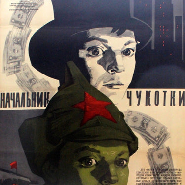 Original vintage film poster for the movie, Chief of Chukotka (Начальник Чукотки), set in Chukotka - the Far East of Russia - after the Russian Civil War in 1922. Dynamic image featuring the main character as a boy wearing a green army cap with a red star on it and fighting on the side, then as a young man above wearing a top hat with a city scene on the side, with money notes running through both depictions. Good condition, folds, minor tears on folds.