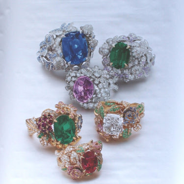 Large original advertising poster for a line of Christian Dior jewellery - collection precieuses (precious collection) - or blanc, or jaune, diamants, saphirs, emeraudes, saphirs roses, rubis, saphirs jaunes et saphires violets (white gold, yellow gold, diamonds, sapphires, emeralds, pink sapphires, rubies, yellow sapphires and violet sapphires). Image of six rings, each featuring a large stone surrounded by smaller precious gems in shapes of bows and flowers, from this collection with the brand name, Dior, at the top and information text below. Dior was founded in 1946 by the French fashion designer, Christian Dior (1905-1957). Very good condition, double sided.